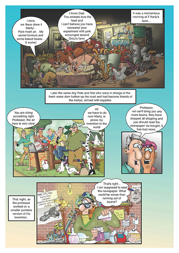 A 46 Page graphic novel for children. The world has only 30 years of air left and scientists clamber to find a solution. One eminent scientist has a theory, but it would mean the elimination of most of the animals on earth. The only person who may be able to save the world and all the animals has been exiled with his family to a distant farm, as his idea is completely unbelievable. Can Professor Aarty convince everyone that his invention using the farts of animals to make fresh air is the only way to ensure they have a future.