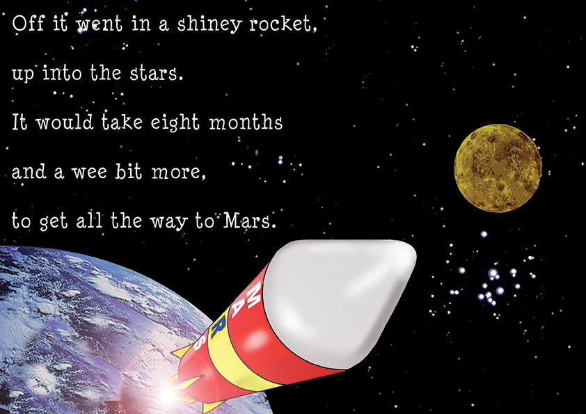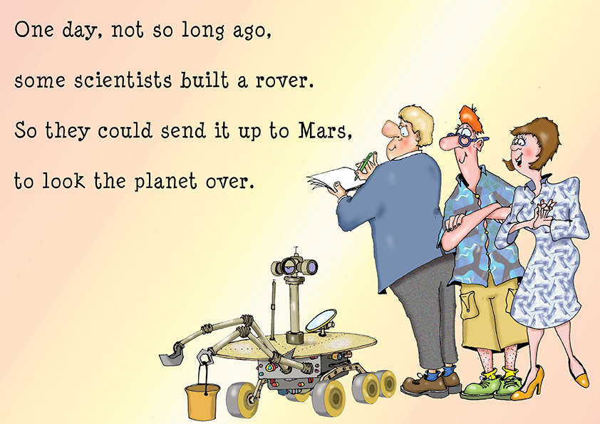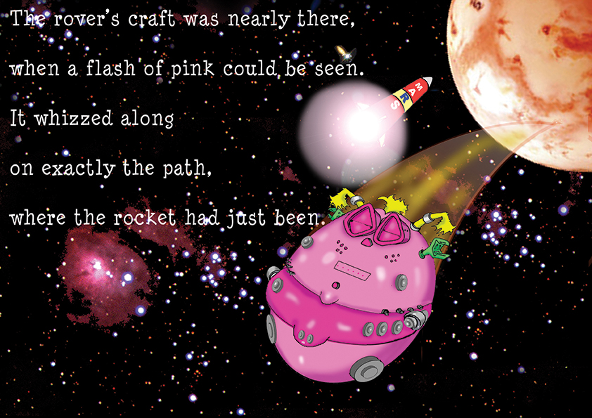 P.E.T.R.A – Pink Extra Terrestrial Roving Accumulator. A 24 page illustrated children’s book. Scientists on earth send a rover to Mars to collect some specimens. Meanwhile a little Mars rover travels to Earth to collect items that might prove Martians once lived there. The story with fun illustrations, also explains why we sometimes lose things and don’t know where they have gone.