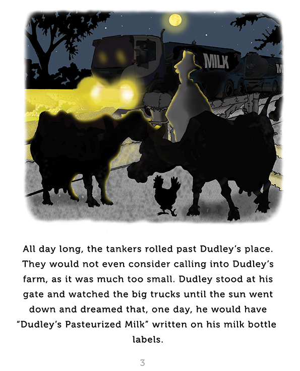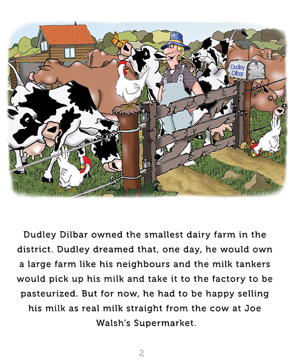 A 32 page illustrated book for children with fun filled cartoon illustrations. Dudley Dilbar dreamed that one day he would have “Dudley’s Pasteurized Milk” written on the labels of his milk bottles, but his farm was far too small for the milk tankers to call upon. How would a very lazy man, a lolly truck and Dudley’s cows make his dream come true?
